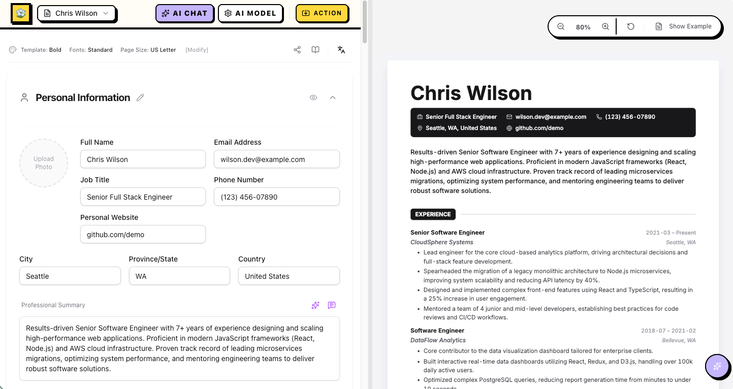 Chat with AI for instant advice, auto-bold key phrases, and tailor content to specific job descriptions.